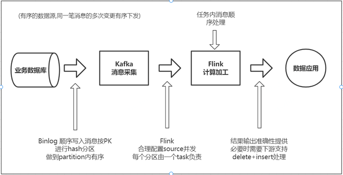 上图是一个简化的过程,业务库流入到 Kafka,Binlog 日志是顺序写入的,根据主键进行 Hash 分区,写到 Kafka 里面,保证同一个主键的数据写入 Kafka 同一个分区存。Flink 消费 Kafka 时,需要设置合理的并发,保证一个分区的数据由一个 Task 负责,另外尽量采用逻辑主键来作为 Shuffle Key,从而保证 Flink 内部的有序性。最后在写入 StarRocks 的时候,要按照主键进行更新或删除操作,这样就能保证端到端的一致性。