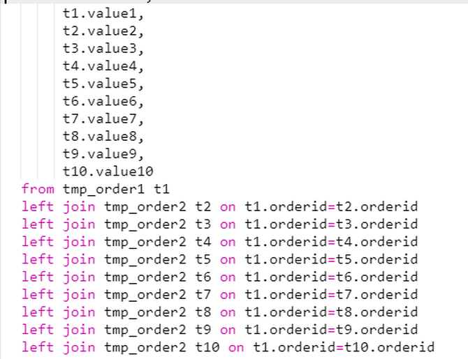 上图中生成订单宽表的 SQL 在离线批处理的时候通常没有问题,但在实时处理的情景下就很难行的通。因为在实时处理时,这个 SQL 会按照双流 Join 的方式依次处理,每次只能处理一个 Join,所以上面代码有9个 Join 节点,Join 节点会将左流的数据和右流的数据全部保存下来,这样就会导致我们这个 Join 的过程需要存储的数据规模放大9倍。