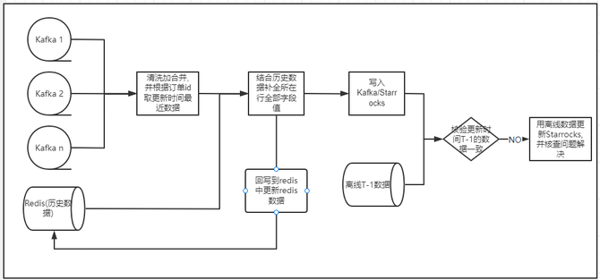 实时数据存在数据丢失或逻辑变更未及时的风险,为了保证数据的准确性,每日凌晨用数据更新时间在 T-1 和离线数据做比对,如果数据校验不一致,会用离线数据更新 StarRocks 中这部分数据,并排查原因。