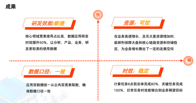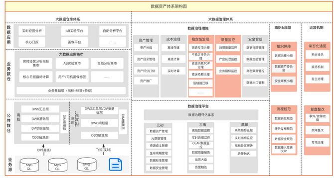 接下来,针对以上问题,他系统性地提出了解决方案,主要是通过平台支撑、组织保证、制度建设、项目落地4个方面,并分享了货拉拉大数据数据资产体系的整体架构。
