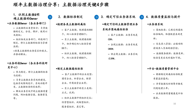 最后,他还分享了顺丰进行主数据治理的实践经验。顺丰的主数据治理有4个关键步骤: