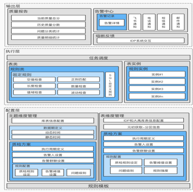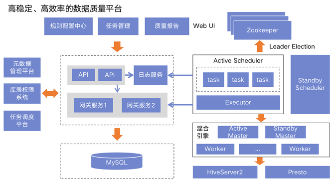 用户可以借助一站式的数据质量管理平台,无需编写代码,便可以完成质量规则的配置、质量检测和自助生成质量报告。对于数据质量检测不通过的,会及时触发告警或者任务熔断,保障及时发现数据质量问题以及防止问题往下游扩散。系统后端服务应用了无状态的微服务架构、调度执行器是多实例部署。保障了数据质量检测的稳定性。同时基于公司自研的混合引擎服务,能够将80%以上的SQL路由到Presto引擎去执行,P80数据质量检测任务能够在5s之内执行完成。