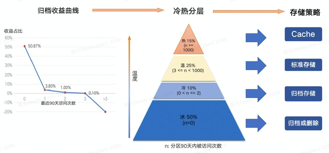 以存储治理为例,在无治理的情况下,面临这些问题:表数量大、且增长快速,冰数据占比多,约33%的数据90天内无访问,但是这些冰数据的存储成本消耗和标准存储一样,造成很大的成本浪费。我们采取了冷热分层归档和生命周期管理等辅助治理措施。冷热分层归档定义了数据冷热分层规则,对热、温、冷、冰数据采用不同的存储策略;再配合生命周期管理,对存量存储持续治理,初期就能有较可观的收益,同时推广运营产品化能力,全面覆盖增量表,能有效抑制存储增长趋势。优化前存储几乎呈线性的快速增长;优化后存储8个月零增长,并且持续下降,目前累计节省54%的存储成本。