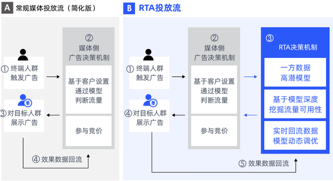 在积累了大量用户行为数据后,利用RTA实时决策的投放方式可以最大化的利用好广告平台和内部的数据模型能力。RTA的核心优势是什么呢?