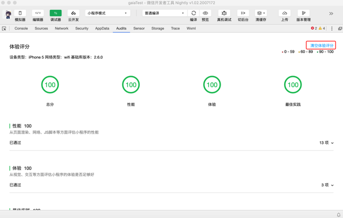 本地开发中微信小程序提供了体验评分工具它会在小程序运行过程中实时检查,分析出一些可能导致体验不好的地方,并且定位出哪里有问题,以及给出一些优化建议。支付宝小程序可以使用全息检测。
