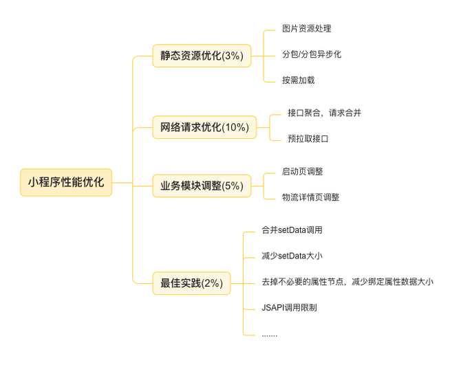 不同平台小程序性能指标构成不尽一致,但主要有三个维度考虑:启动性能、网络性能、运行性能,其中网络性能主要包含请求耗时及请求错误率,和接口质量以及用户网络状况强相关,所以此次性能优化的重点放在启动性能以及运行性能。