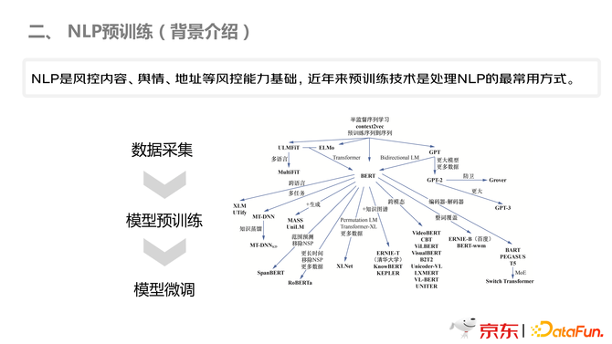如上图所示,NLP 是风控内容、舆情、地址等风控能力的基础,而且,近年来,预训练技术是处理 NLP 的最常用的方式。整体的流程如上图所示:首先数据采集,然后进行模型预训练,最后对模型进行微调。