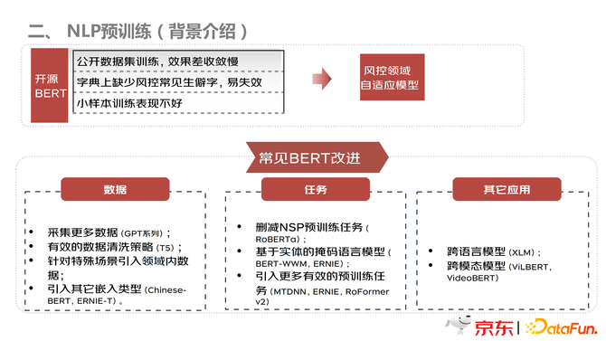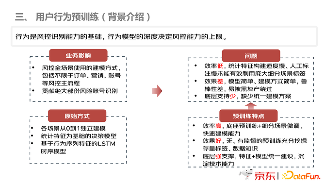 导读:本团队主要负责京东零售领域的风控算法模型构建,针对京东零售风控方面,业务要求不断地更新、模型失效快、更新迭代慢以及成本高昂等情况,我们提出了自己设计研发的 NLP 预训练架构模型和用户行为预训练模型,并进行预训练模型的平台化,方便一键部署开发,快速迭代,简单易用,推理速度提升等,有效解决了业务问题,并在公开数据集上也得到了很好的效果。