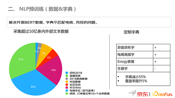 如上图所示,结合调研的情况,本团队在数据和字典这一块,做了风控领域的数据和字典。如上图左图所示,主要是零售领域的业务数据,以及电商领域的数据,为了具有泛化能力,需要社区互动、对话数据以及百度百科等的数据,总共采集了 10 亿条数据;在字典方面,如上图右图所示,增添了异音异形字、电商高频字、生僻字等。