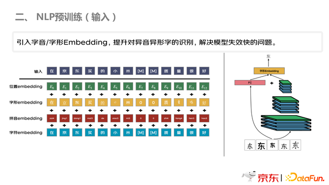 如上图所示,第一步将语料和字典构建好,但是,如果仅仅引入生僻字,还是不具备足够的泛化能力, 如果输入换了一批生僻字,还是不能很好的识别,本团队进行充分实验和调研,针对异音异形字,有很多情况是形不一样,但是音一样,比如“+”和“加”,是一个音,所以添加了拼音的编码。另一块就是字形,比如“京东”的“京”,再加一个单人旁,变成“倞”,和“京”很相似,所以也引入了字形的编码,从而提高对异音异形字的识别。