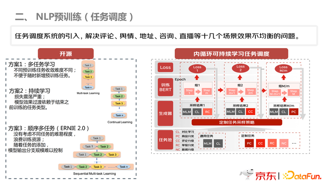 接下来,针对任务调度进行规划。引入任务调度,主要是为了解决不同的业务场景,比如评论、舆情、地址、咨询、直播等十几个场景效果不均衡的问题。如上图左图所示,是本团队调研的开源的解决方案。方案1主要是通过多任务的学习方式进行学习,所以,会导致不同任务的收敛程度不一致;方案2是通过持续学习,但是,但是,比如 task1 已经学习的非常好了,但因为后面的 task 并没有训练好,共享的BERT部分的参数还是会不断的调整,可能会破坏 task1 已经学到的特征;方案3是结合了方案1和方案2,有一定的优化,但是,task 的难易程度是人为定义的,具有很大的主观性,而且,也还是会存在 task1过度训练的情况。