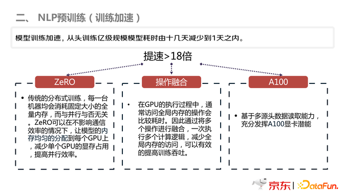 接下来,如上图所示,是本团队针对训练加速的方案设计。如果按照传统的训练方式,从头训练一个亿级的规模模型需要十几天的时间,如果是 T5 模型需要几十天,耗时过长。本团队基于京东自己的架构,并对数据和模型进行改进。首先,使用 ZeRO 的框架,可以在不影响通信效率的情况下,让模型的内存均匀的分配到每个 GPU 上,减少单个 GPU 的显存个,提高并行效率。其次,在操作融合方面,通过将多个操作进行融合,一次执行多个计算逻辑,减少全局内存的访问,有效的提高训练吞吐。最后,基于多源头数据读取能力,充分发挥 A100 显卡潜能。