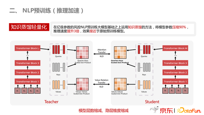 推理加速方面,因为模型部署主要是实时场景,对时延要求比较高,所以需要对模型进行蒸馏,提高推理速度。基本上使用业界的主流方式,将模型参数压缩 90%,推理速度提升 3 倍,效果接近于原始预训练模型。