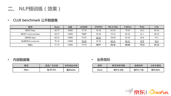 上图是本团队预训练模型的效果展示。因为使用了开源数据集的缘故,所以具有泛化性,在开源的 6 个数据集上,基本上都达到了最好的效果。在内部数据集上,广告识别,以及异常地址识别,有非常明显的提升。在业务指标上,模型更新以及建模速度有了非常大的提升,并且小样本训练的效果有了非常大的提升。
