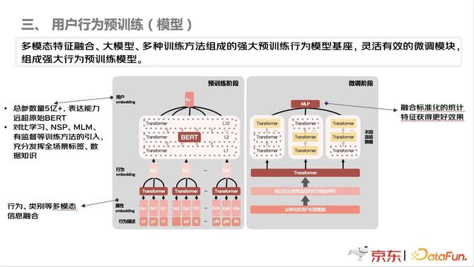 上图展示了用户行为预训练模型的整体算法模型。首先,将用户的行为、类别等多模态信息进行融合,通过 Transfermer 将其转化成统一的行为特征,输入到 bert 中进行预训练。总的参数量达到了 5 亿多,表达能力远超 Bert 模型。未来使用预训练模型达到业务目的,本团队也应用了很多对比学习的方法,比如 NSP、MLM、有监督等方法,放到内循环的学习系统里面,使模型充分地学习到数据的知识。下一个阶段,是进行微调。当微调的样本不是很多,由于参数量很大,为了防止微调调偏,需要定制化的操作,比如冻结部分参数等,使模型具有更好的泛化性能。