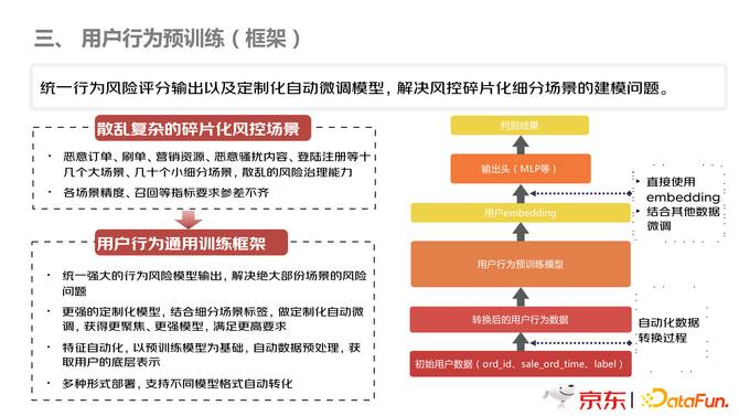上图是整个用户行为预训练的框架。风控的场景有很多,比如恶意订单、刷单等,异常的散乱复杂,而且碎片化,每个场景的准确度、召回率等要求不尽相同,所以需要考虑框架的适用性和泛化性。如上图右边所示,在自动化数据转换过程中,直接将用户的数据封装起来,不同场景的输入,作为参数,输入到数据中,然后输出转换后的行为数据。并且将预训练模型训练过程也进行封装,主要是对微调阶段进行训练处理。在微调阶段,根据自定义模式,对模型进行微调,这样不管业务是几十个,甚至几百个场景,底层的训练是保持不变的,微调阶段可以部署到不同的业务场景。