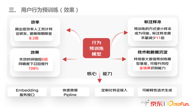 预训练模型的特点,可以克服以上几个问题,毕竟预训练是站在巨人的肩膀上,底座模型加细分场景微调,可以快速建模;并且效果好,有监督、无监督预训练可以充分挖掘存量标签、数据知识等;由于特征和模型统一建设,底层具有强支撑。