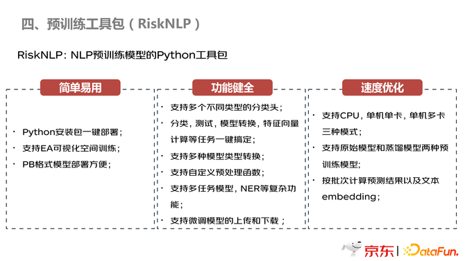 如上图所示,本团队将 NLP 这块的内容封装到 RiskNLP 包中,非常简单易用,而且功能十分健全,比如支持多种模型类型转化,多任务模型,NER 等复杂的功能,都可以一键式训练出来;并且训练速度,推理速度等,都可以一键式的配置,非常方便。