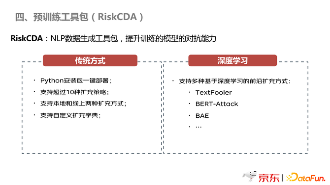 上图是本团队提出的 RiskCDA 工具包,主要是提高异音异形字的对抗能力。这个工具包,既支持 Python 安装包一键部署,还支持本地线上扩充方式,并且支持自定义词典,最重要的是支持多种基于深度学习的前沿扩充方式,比如 TextFooler 等。