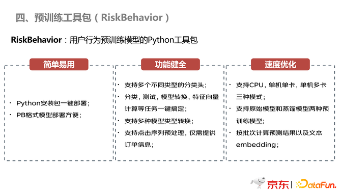 最后,如上图,是用户行为预训练模型的工具包——RiskBehavior 包。一键部署使用,与前面包所不同的地方就是这边的特征展出,也是部署成为服务的形式,针对内部需要的特征,都可以进行产出。并且在速度优化方面,也得到了很好地实现。