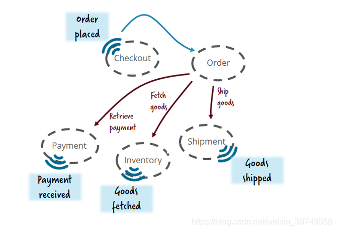 “Inventory”服务收到消息,从仓库里取货,并发送“Goods fetched”消息。“Shipment”服务得到消息,发送货物,并发送“Goods shipped”消息。