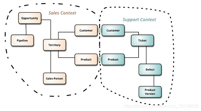 DDD中有一个很重要的概念,有界上下文(Bounded Context),可以用有界上下文来划分微服务,每个有界上下文都可以是一个微服务。下面是有界上下文的示例。下图中有两个服务“Sales”和“Support”。
