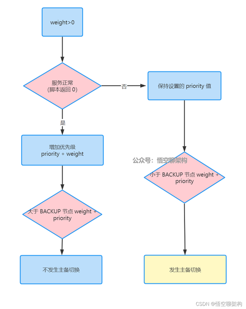 如果 MASTER 节点的 vrrp_script 脚本检测成功时,如果 MASTER 节点的 priority 值大于 BACKUP 节点 weight + priority,则不发生主备切换。