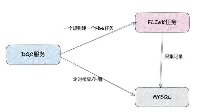 因此在第一版方案中,用户每新增一个采集对象或一个规则,DQC服务会为用户重新生成一个新的Flink任务来完成采集,并将采集结果写入到MySQL中。同时定时触发质量规则检查,将检查结果写入到MySQL中,并根据检查结果判断是否做告警通知。