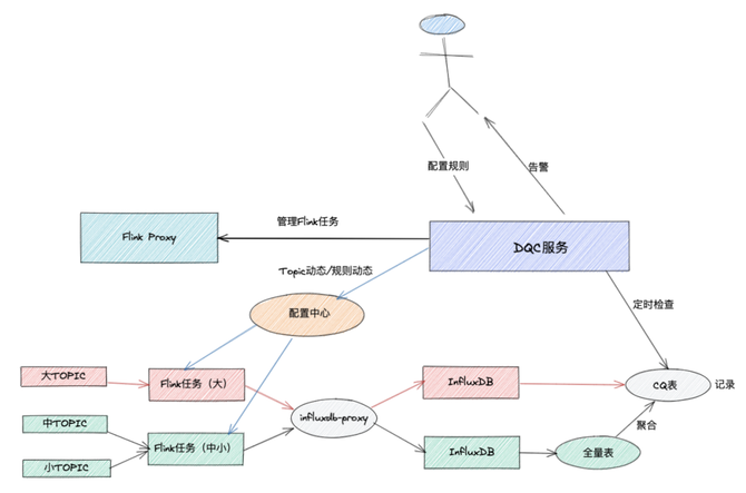 目前线上Topic 有7000+,为了便于管理,主要根据Influxdb能接受的QPS、及Flink任务利用率,实时DQC把Topic划分为大Topic、中Topic、小Topic。小Topic: 消息量 <1000/s,中Topic: 消息量 (1000/s—10w/s),大Topic: 消息量 > 10w/s。