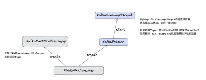 解决方案:因为开发人力、时间的原因,没有完全开发一个新的支持动态Topic的Kafka Consumer,而是扩展了FlinkKafkaConsumer,KafkaFetcher && KafkaConsumerThread采用hack方式处理。