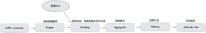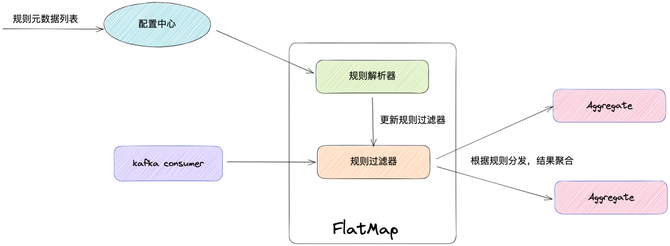 动态逻辑:规则动态化,规则元信息维护在配置中心,FlatMap可以感知规则变化,将规则命中的记录向后输出进行聚合