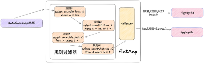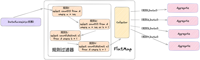FlatMap数据输出格式调整为 <分组Key,RuleIdList,Data>。将数据命中的所有规则ID合并在一起,向后输出。聚合算子收到数据后,根据RuleIdList进行业务计算。