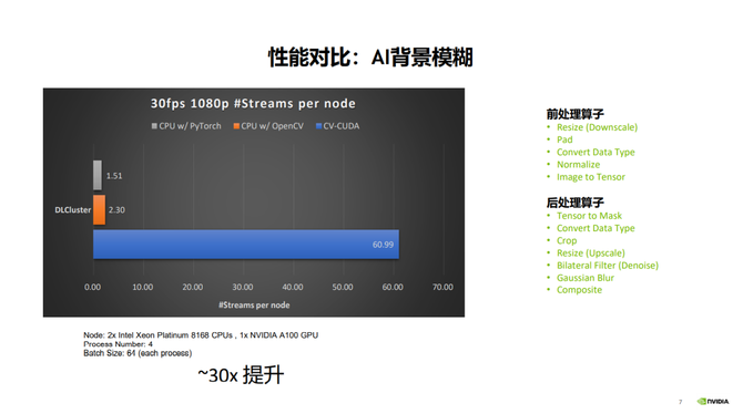 通过图中数据对比可以看到,在相同的服务器和参数配置下,对于 30fps 1080p 视频流,OpenCV 最多可以开 2-3 个并行流,PyTorch(CPU)最多可以开 1.5 个并行流,而 CV-CUDA 最多可以开 60 个并行流。可以看出整体性能提升程度非常大,涉及到的前处理算子有 resize、padding、normalize 等,后处理算子有 crop、resize、compose 等。