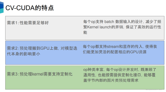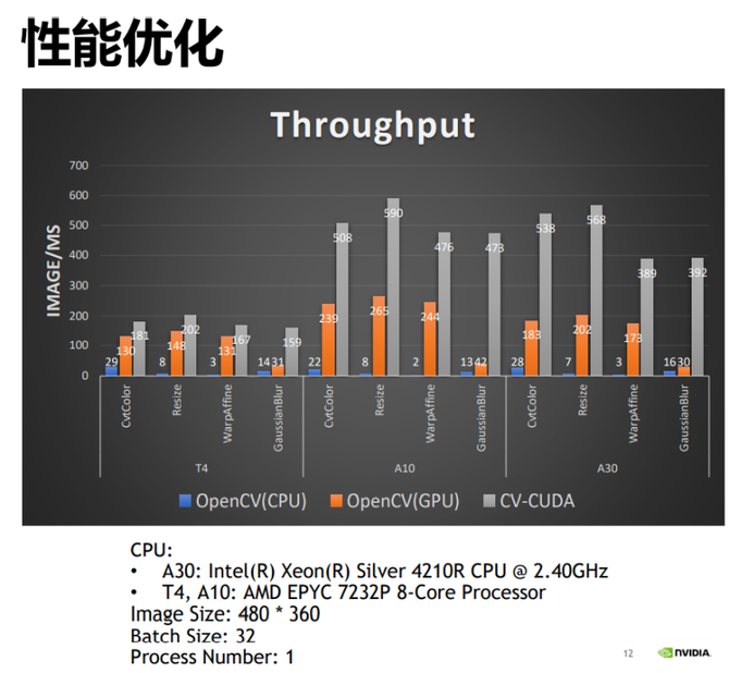 硬件方面,CV-CUDA 基于 GPU 的并行计算能力,能够大幅提高前后处理的速度和吞吐,减少模型计算的等待时间,提高 GPU 的利用率。