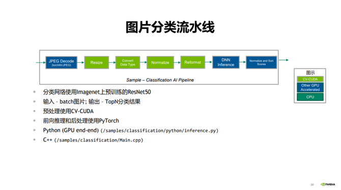 在图片分类的流水线中,首先是 JPEG decode,其对图片进行解码;绿色部分是前处理步骤,包含 resize、convert data type、normalize 和 reformat;蓝色部分是使用 PyTorch 的前向推理过程,最后对分类的结果进行打分和排序。