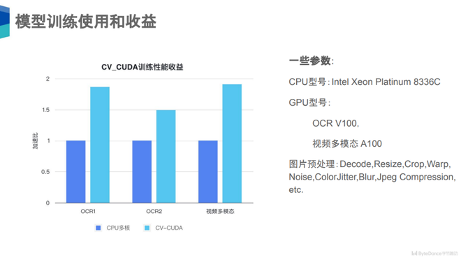 在模型训练上,可以看到在 OCR1、OCR2、视频多模态三个任务上,使用了 CV-CUDA 后获得了 50% 到 100% 的性能收益。