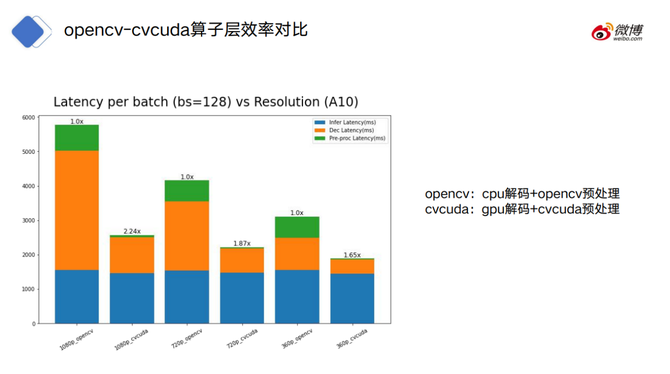 可以看到,对于 CPU 解码的 OpenCV,OpenCV 的解码和预处理都比 CV-CUDA 的耗时高得多。
