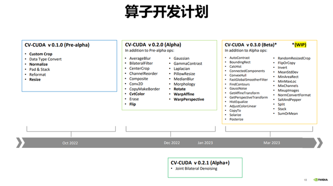 2022 年 12 月,CV-CUDA 发布了 alpha 版本,其中包含 20 多个算子,比如常用的 Flip、Rotate、Perspective、Resize 等。