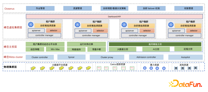 同时,峰峦引入云原生虚拟集群技术,屏蔽底层混部资源来自不同的城市和地域导致的分散性特点。太极平台直接对接峰峦租户集群,该租户集群对应底层多种混部资源,而且租户集群拥有独立和完整的集群视角,太极平台也可无缝对接。