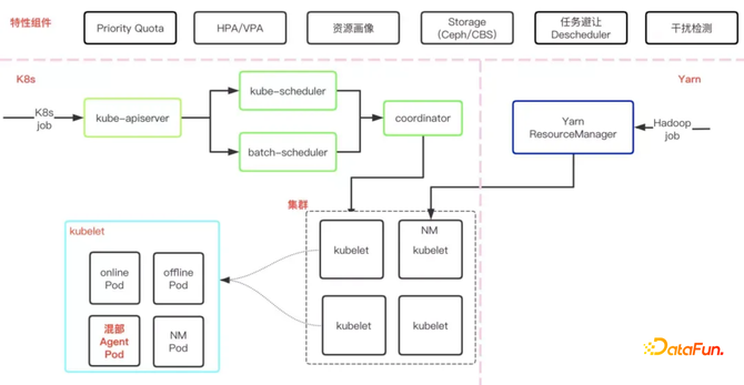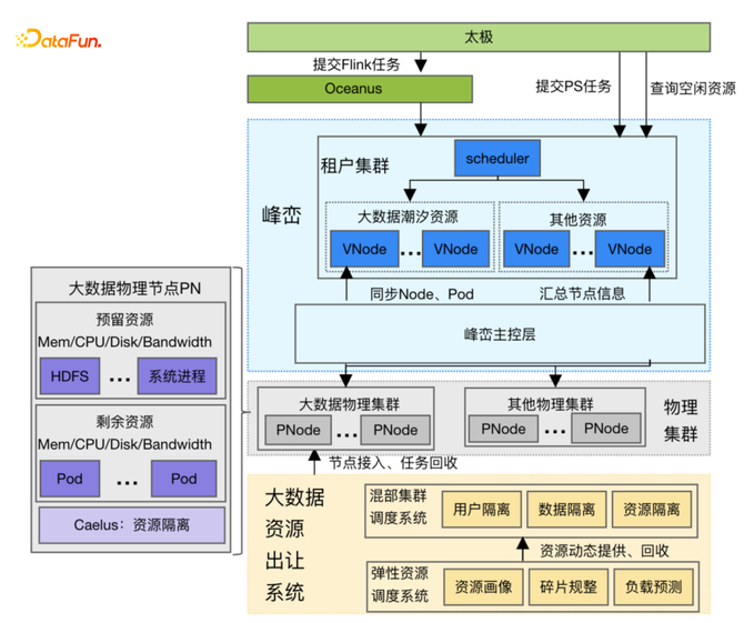 Caelus 混部系统:虽然出让系统腾挪出来的机器资源上没有运行大数据作业了,但上面还运行着 HDFS 服务,还提供着数据读写服务。为了保护 HDFS 服务,引入Caelus混部系统,将 HDFS 作为在线服务,通过 Caelus 一系列的在线服务保证手段(如:通过 HDFS 关键指标检测其是否受到影响)保证 HDFS 服务质量不受影响。