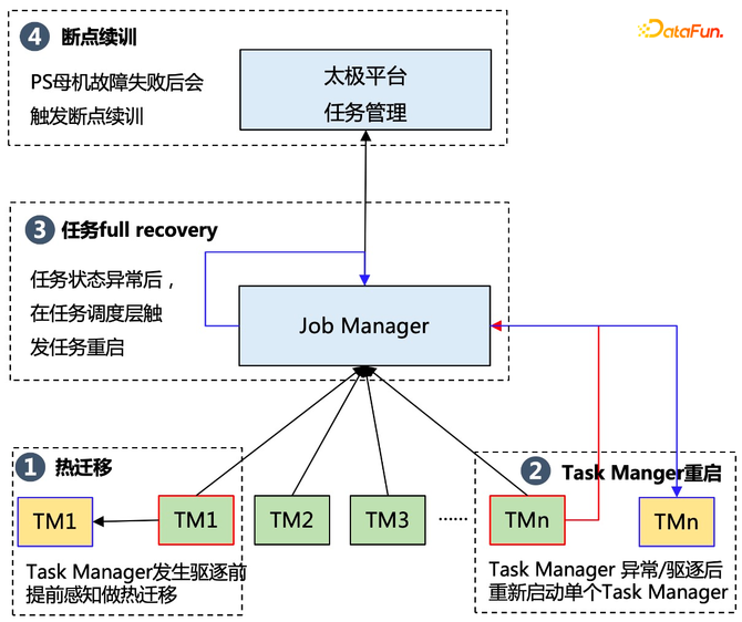Task Manager 重启:当任务当中一个 Task Manager 由于异常或者驱逐等原因导致运行失败之后,整个任务不会直接失败退出,而是先保存该 Task Manager 的状态,然后重新启动该 Task Manager,从而降低整个任务失败的概率。