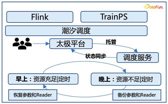 针对潮汐资源要求离线训练任务只能白天使用,晚上需要提供给在线业务使用,所以太极平台需要在白天时根据资源到位情况,自动启动训练任务;在晚上对任务做冷备,同时停止对应的训练任务。同时通过任务管理队列来管理每个任务调度的优先级,对于晚上新启动的任务会自动进入排队状态,等第二天早上再启动新的任务。
