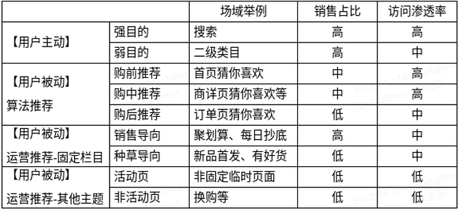 一般电商类平台各场域,用户访问率&销售占比高相对关系如下: