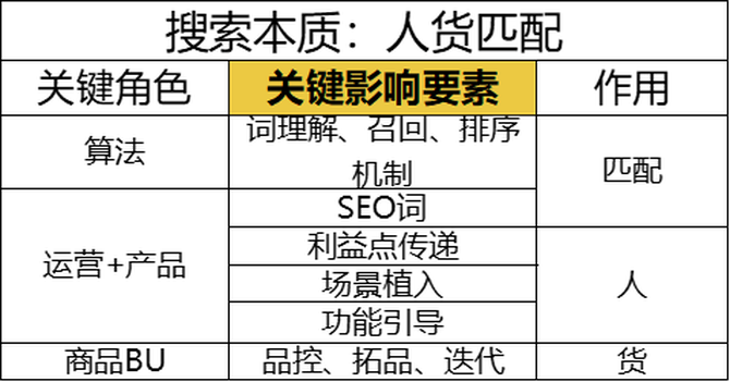 就个人理解搜索本质还是人货匹配,不同的业务角色影响不同的因素,作用于不同的环节。