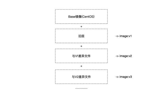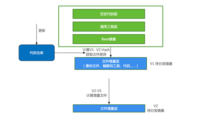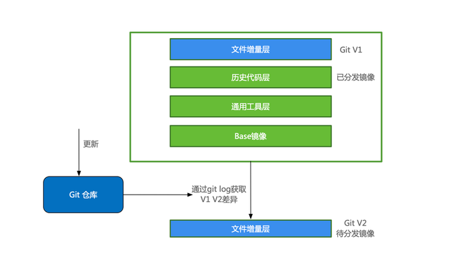 在构建系统中记录当前版本之后,下次构建时,可用本次版本的镜像(或一个已被分发的镜像版本)作为 Base 镜像,重复以上构建步骤,每次构建都将叠加属于此版本的仅有差异文件的新层。如图4所示。