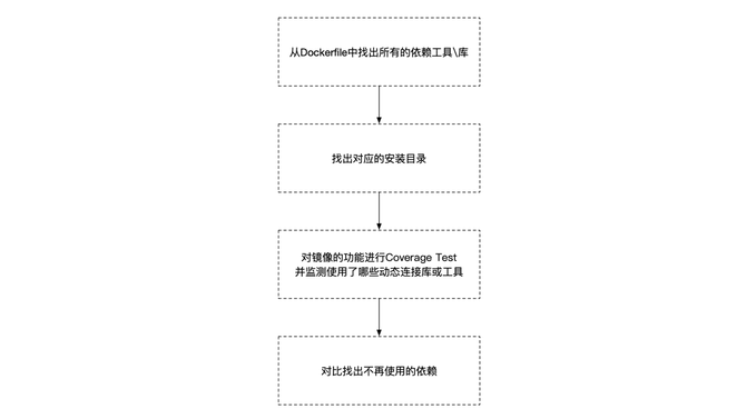 镜像构建所涉及的业务繁杂,有些工具或之前在镜像中用 YUM/APT 安装的库已经不再使用,但由于工具缺乏明确的责任人,很难得到及时清理,久而久之,镜像体积愈加臃肿。镜像去重是指通过运行任务,明确任务所需依赖,从而使镜像所使用资源体积达到最小。具体实现方式为对镜像进行 coverage test,通过 ldd 动态链接,找到执行程序所需的所有动态库,与 Dockerfile 中安装的工具做比较,未使用的动态库可视为该版本已不需要,可删除进行去重,如图7所示。