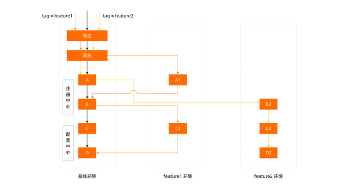 理想中的开发环境逻辑隔离应该是这样的,基于 git-branch 的设计理念,保留一套稳定的基线环境,各个分支的开发同学通过逻辑环境隔离的方式快速拉起需要开发的 feature 环境。我们只需要维护一套完整的基线环境,在增加 feature 开发环境时,只需要单独部署这个 feature 所涉及到改动的应用即可,而不需要在每个 feature 环境都部署整套的微服务应用及其配套设施。其中,基线环境包含了所有微服务应用,也包含了服务注册中心、域名、SLB、网关 等其他设施,而 feature 环境中只包含了这个 feature 中需要修改的应用。这样维护 n 套 feature 环境的成本,就变成了加法,而不是原来的乘法,由 n × m 变成了 n + m。这样算下来相当于零成本增加 feature 环境,这样我们就可以放心地扩容出多套 feature 环境。极氪团队使用微服务治理中的全链路灰度方案实现“流量泳道”,做到快速拉起隔离的开发环境,在提升研发效率的同时节省了一笔不菲的成本开销。