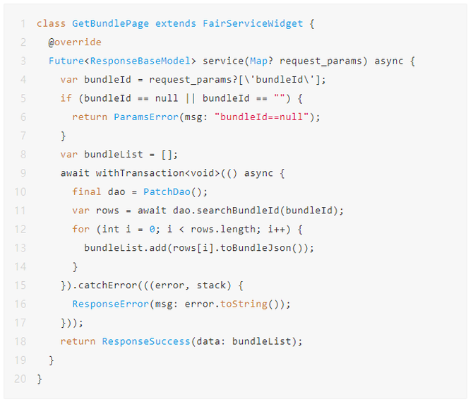 我们封装了FairServiceWidget可以通过继承实现server()来很方便的获取HTTP接口请求的参数;PatchDao是ORM框架的模型的实现类后面会详细介绍,可以通过他来实现数据库的增删改查,searchBundleId是查询数据的具体SQL语句,最后通过toBundleJson来实现数据的序列化。以动态化平台实际的功能获取Bundle资源接口为例,一个完整的HTTP接口请求大致如下1、继承FairServiceWidget实现Server()处理业务逻辑2、通过request_params获取请求的参数和参数的校验3、参数正确会通过PatchDao查询远端数据库信息4、获取bundle数据后会进行Response封装返回: