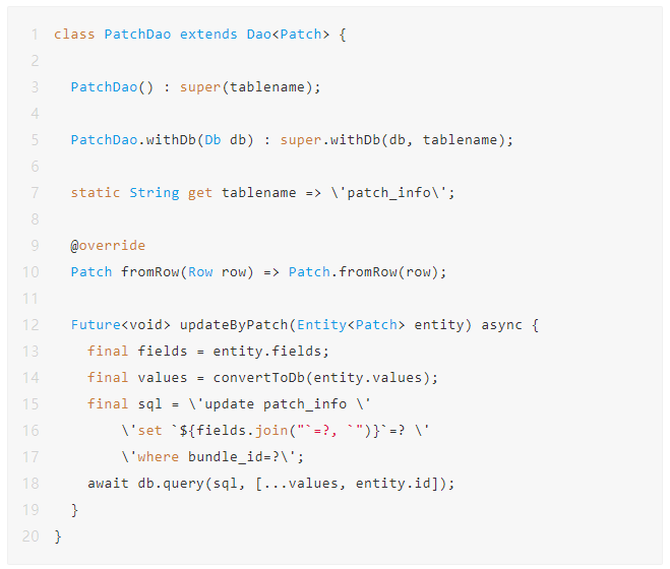 在Dart Server中实现ORM需要封装对数据库的连接、数据对象映射和增删改查等,可以按照前面介绍的获取Bundle资源接口为例子,需要先创建PatchDao类,内部需要实现了对数据信息的封装,只需要填写要操作的表明、映射的对象类和关键查询语句即可。比如要更新补丁表信息则可以直接传入最新的映射的对象类实现更新即可。