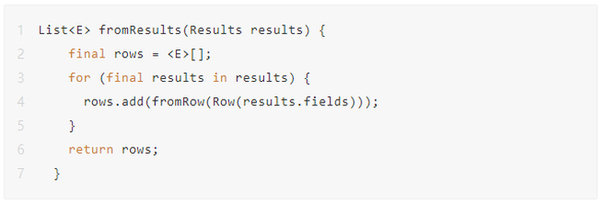 可以看到上面在做update的sql语句是通过拼接处理,我们提供一套公共sql语句模板,然后在具体实体对象操作的时候将实体对象的属性名称和属性值当作参数拼接进去,组装成完整的sql语句。如果查询操作则会根据返回的数据映射成Dart对象类,所以数据驱动返回的数据通常都是以数据为核心的数据集合,我们通过ORM框架将类对象和数据库返回的列数据进行一一匹配获取,然后赋值到对象上:
